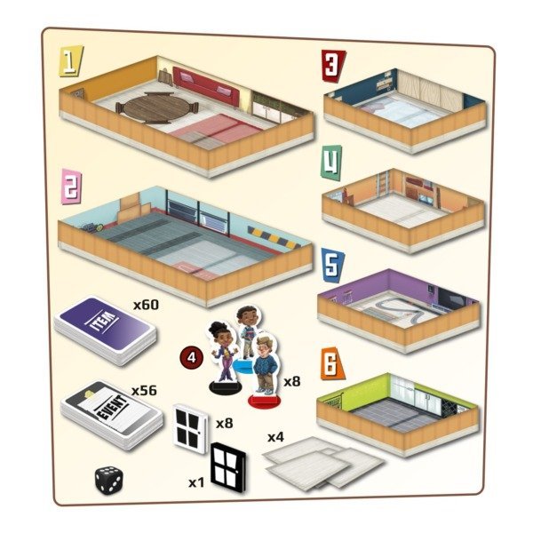 Cada misión cuenta con una configuración de casa distinta, que tendremos que construir mediante las distintas cajas-habitaciones y las puertas de madera. ¡La casa tendrá una dimensión real en nuestro tablero de juego! Cada uno de los jugadores representará a uno de los miembros de la familia. En su turno tendrá que gastar puntos de acción para recoger objetos de las habitaciones y llevarlos a los lugares que corresponda para conseguir el objetivo de la misión. ¿Seréis capaces de sacar todos los trastos de las habitaciones y llevarlos a la buhardilla antes de que os abduzcan los aliens? ¿Podréis ayudar a Santa Claus a cargar todos los regalos en el trineo que tiene aparcado en vuestro garaje?