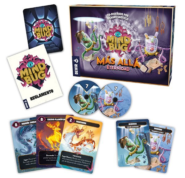 ¡La muerte no es la última frontera en Mindbug! De los confines de la eternidad llegan un montón de criaturas dispuestas a combatir en duelos épicos de alto voltaje estratégico. Esta expansión completamente independiente del Mindbug original pone a nuestro alcance nuevas tácticas y combinaciones, con criaturas potenciadas y habilidades que puedes jugar desde la pila de descartes.