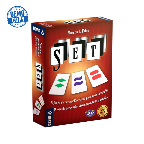 Convertido en todo un clásico, Set es un título que hace décadas que seduce a jugadores en todo el mundo y que acumula decenas de premios. La aparente sencillez de su diseño y mecánicas hace que sea muy fácil empezar a jugar, pero todo un reto ganar. El juego consta de 81 cartas, todas diferentes pero similares. Se barajan todas las cartas y se colocan 12 sobre la mesa, a la vista de todos los jugadores. Para hacer un Set simplemente hay que recordar una única regla: hay que formar un grupo de 3 cartas en las que cada una de las 4 características sea igual o diferente en todas ellas. Las características son: color (verde, rojo o morado), número (uno, dos o tres), forma (rombo, óvalo y onda) y relleno (rallado, sólido o vacío).