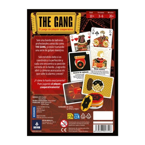 Diseñado por John Cooper y Kory Heath, The Gang permite partidas para grupos de 3 a 6 personas, a partir de 10 años, de unos 20 minutos de duración. Una partida de The Gang consta de 3 a 5 golpes. Cada golpe consta de 4 rondas, seguidas de la fase de Revelar. Al final de cada golpe, comprobaras si haz tenido éxito o no. Gana la partida si tienen éxito en 3 golpes. Pierdes si fracasas 3 veces.