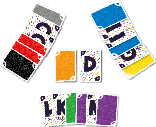 Para empezar a jugar, barajad las 50 cartas (que por un lado tienen una letra y por el otro muestran un color) y formad dos mazos de más o menos del mismo tamaño. Dad la vuelta a uno de ellos y volved a barajar, de tal forma que letras y colores se mezclen. Tomad las dos primeras cartas y colocadlas de modo que una muestre una letra y la otra un color.